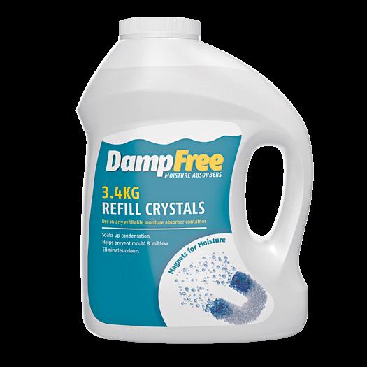 DampFree products are filled with moisture-absorbing crystals. These moisture magnets soak up humidity and dampness, reducing mildew, mould and fungus, as well as eliminating the musty odours they cause. As the crystals pull in moisture from the air, they simply dissolve, making them easy to discard and top up using the refill crystals or pouches