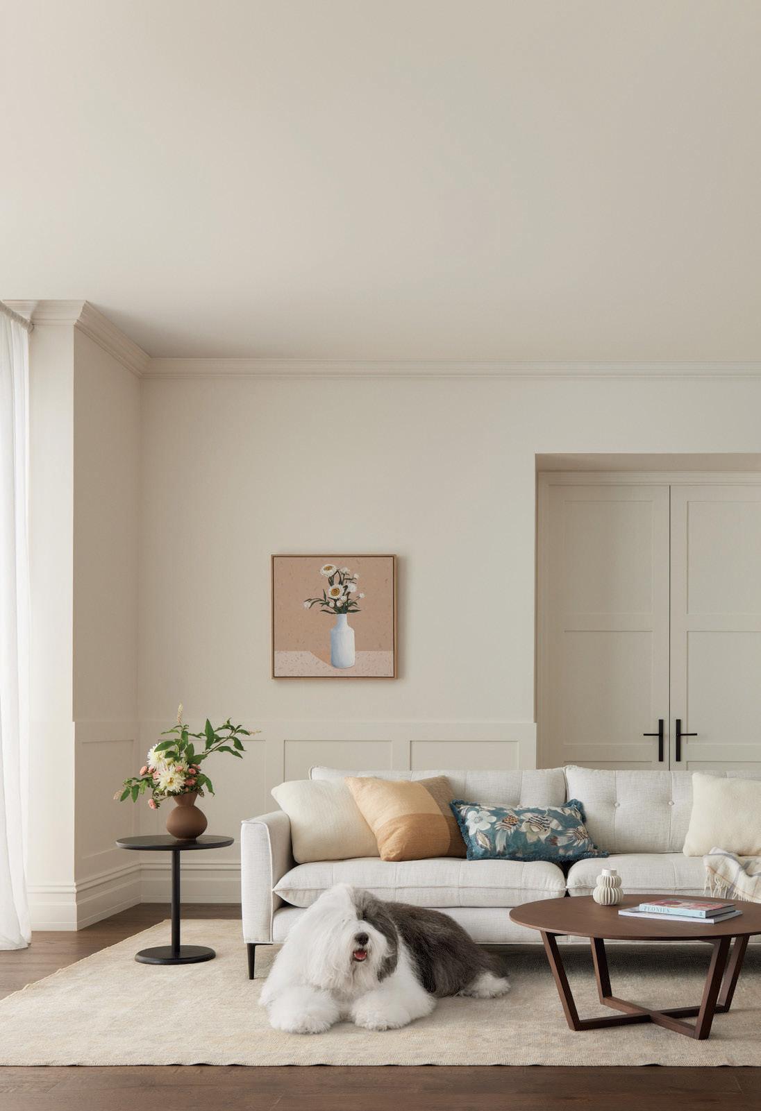 Dulux Lexicon® Quarter – This colour thrives in modern, open-plan spaces. Andrea mentions that, “If you have colourful furniture or artwork, it’s a fabulous backdrop.” Use the cool undertones to temper bright light or give the illusion of more space. It can also add a minimalistic edge to your room.