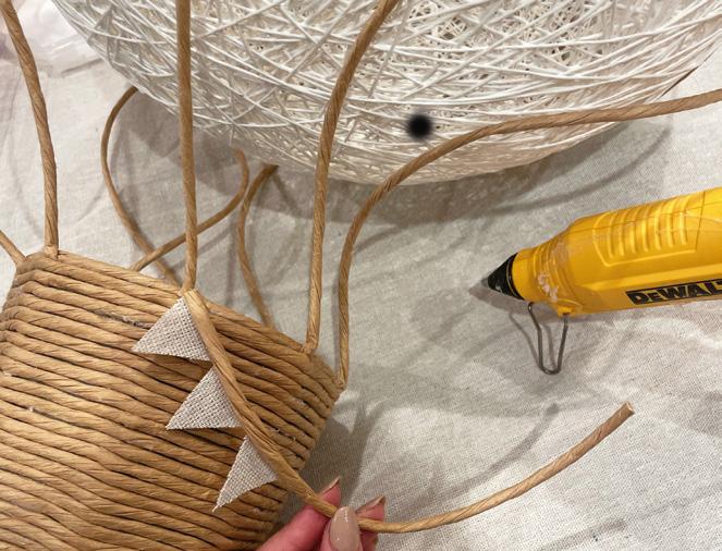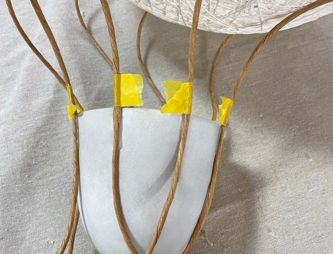 3 Divide the pot rim into eight and mark with pencil. Measure equal drops down the vertical ropes and mark with tape, then hot-glue to the pot at the pencil marks and around the base. Trim the ends.