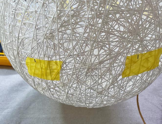 1 Disassemble the pendant light, measure halfway down the shade, then divide this circumference into eight and mark using painter’s tape and a pencil.