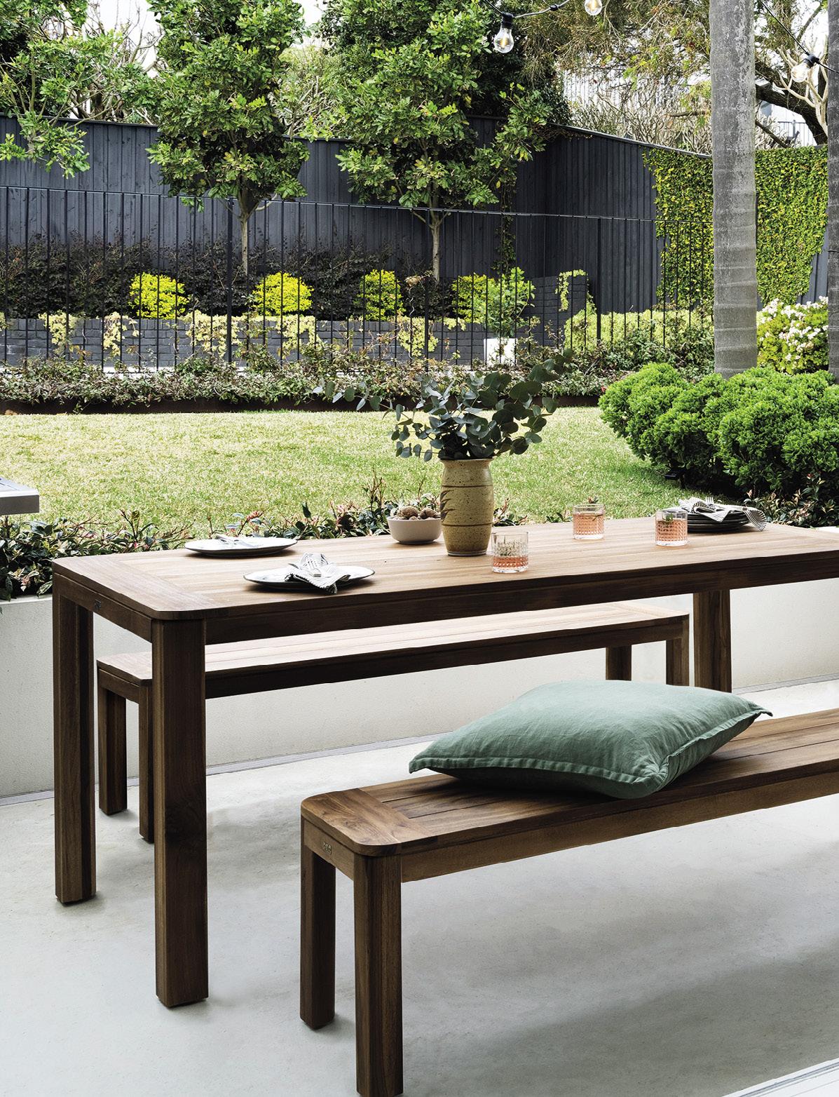 The dimensions and shape of your area will influence your options. A deep deck is ideal for a social set-up with adjacent sofas and a coffee table, while a slender patio can create a quiet retreat with a daybed and side table. If you’re pushed for space, prioritise the items you’ll use the most, like a lounge setting for entertaining or a round table with armless chairs for a smaller area. Bench seats can often squeeze on an extra body when needed – just add bench cushions for added comfort! Don’t forget to consider proximity – for example, do you want your outdoor dining area to be near the cooking zone or slightly separate to it? Would you prefer play spaces to be close to the house, or some distance apart?