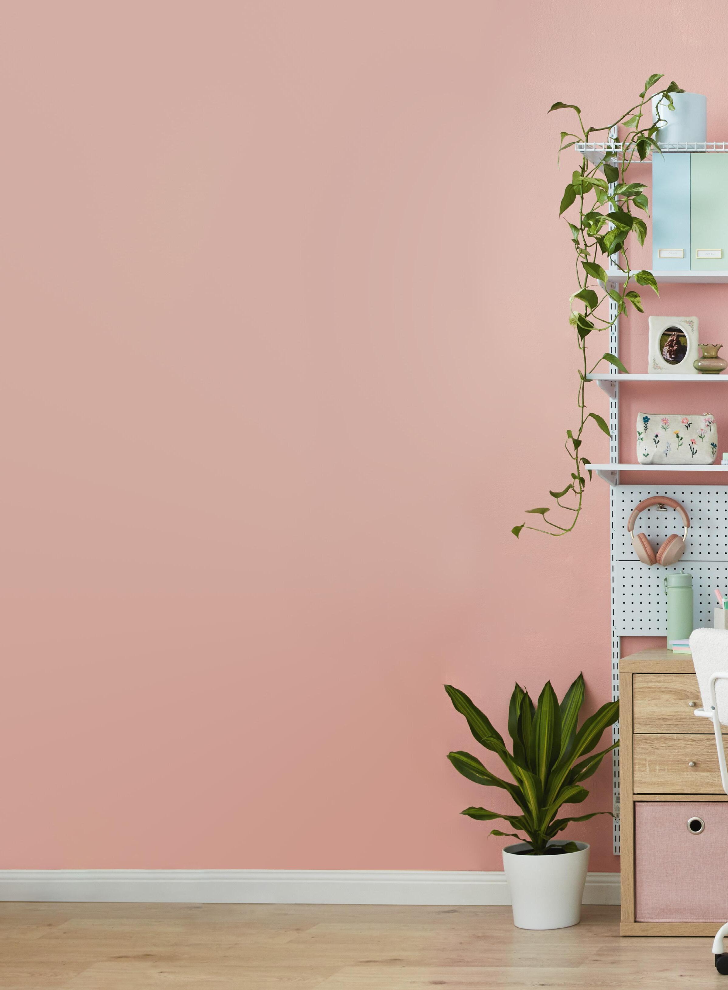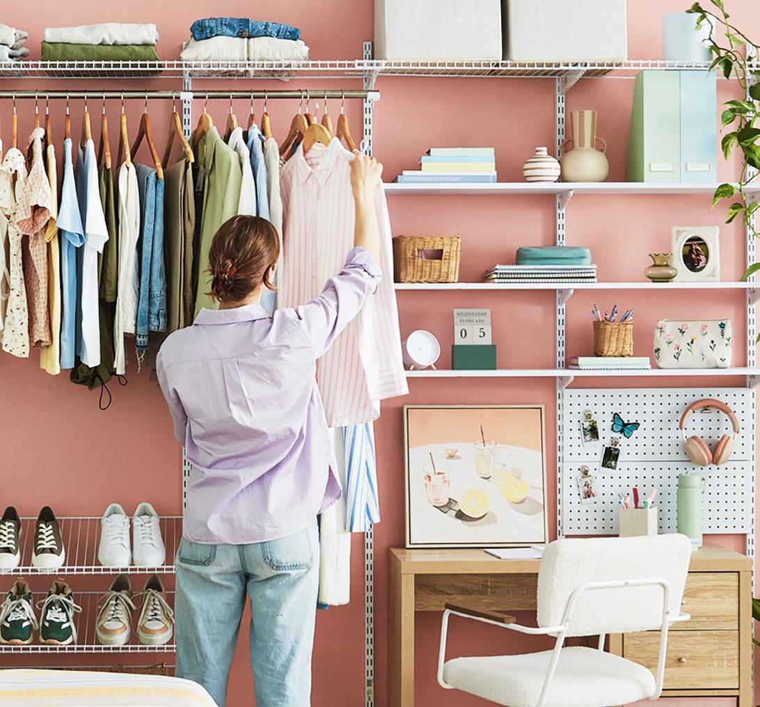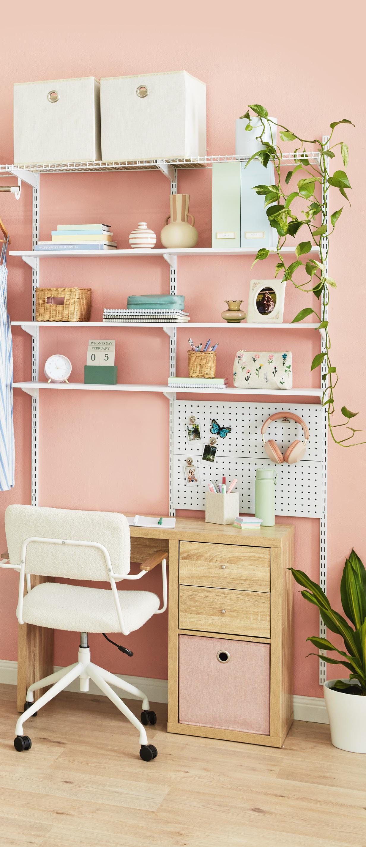 double slot back wire shelves B, $22.62 each, I/N: 2660969, 1200mm x 250mm x 16mm matt shelves, $16.19 each, I/N: 2710157, hanging rod brackets, $7.13/pack of 2, I/N: 2660995, 170mm double slot brackets, $3.92 each, I/N: 2583643, 350mm double slot angled wire shoe shelf brackets, $10.11/pack of 2, I/N: 2610019, mesh 3 basket frame kit, $122.27, I/N: 0168744, 572mm x 200mm pegboard backing plate, $17.30, I/N: 2583303, all in White; 1800mm stainless steel hanging rod, $22.76, I/N: 2662033, and stainless steel hanging rod end covers, $2.89/pack of 4, I/N: 2663662. ● Flexi Storage ‘Clever Cube’ 760mm x 410m x 390mm 1 x 2 storage unit in White, $43, I/N: 2583382 (used as a bedside table), 1 x 2 cube storage desk in Oak, $140, I/N: 0125526†, 376mm x 335mm x 335mm 2 drawer insert in Oak, $35, I/N: 0079582, and 370mm x 330mm x 330mm inserts, $9.97 each, in Sandy White, I/N: 2583443, and Blush Pink, I/N: 0082385. ● Porter’s Paints ‘Dandelion’ 61.5cm wallpaper in Celadon Green, $195/10m, I/N: 0311665†. ● Verve Design ‘Lizelle’ tripod floor lamp, $119.98, I/N: 0261996. ● Practa timber clothes hangers with bar, $4.99/pack of 5, I/N: 0484052. ● Devil’s ivy in 14cm x 12cm glazed indoor cache pot in White, $3.98, I/N: 0033500. ● Bayliss ‘Cortina’ 290cm x 200m wool rug, $419, I/N: 6670903. ● Senso by Gerflor ‘Essential’ 3m DIY vinyl sheet flooring in Noma Blond, $78.99/m, I/N: 6610233. ● Happy plant in Scheurich ‘Vander’ 24cm x 22cm pot in White, $35.98, I/N: 2891240. All plants sold separately. All other products, stylist’s own. Some advertised services and products are not available at some Bunnings stores, but products can be ordered.