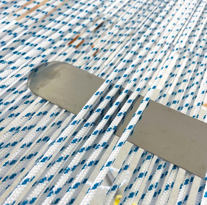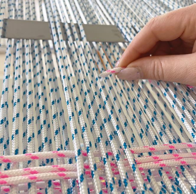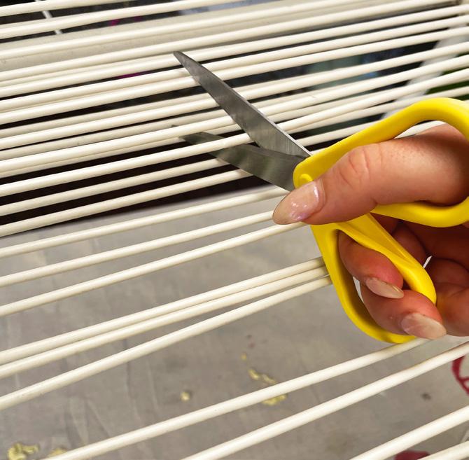 5 When the seat is complete, tie off rope. Repeat to weave the same colour vertically on the chair back (see Get the look, opposite). To set up the weft (crosswise weaving) insert a steel rule or palette knife over and under every five warp strands.