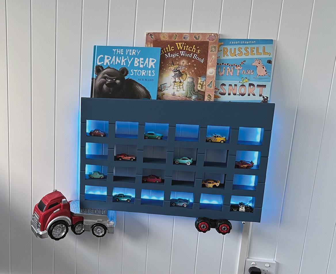 Looking for a creative way to boost bedroom storage, Bunnings Workshop community member Claire (@Renowayoflife) built a custom rack for toys and books that doubles as a nightlight. “I wanted to make a fun and engaging storage system for my son’s much-loved cars and trucks that could also hold a few books for bedtime reading,” says Claire. She cut leftover VJ panels into strips, then made cutouts using a router so the horizontal and vertical pieces could slot together. With the frame nailed into place, Claire made a face piece from another VJ panel. After sanding and filling the nail holes, she finished the job with primers and paints from the Dulux Duramax range. An LED light strip was cable-tied to the back of the frame and, in a fun touch, a toy truck glued to the base ‘tows’ its load. The rack is attached to the wall with angle brackets. View Claire’s handiwork and projects from other Workshop community members at workshop.bunnings.com.au.