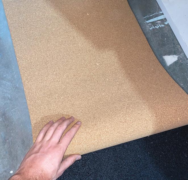 3 Attach the self-adhesive cork sheet to the rubber by ensuring that the corners of the cork sheet are square at the top. As you roll the cork out, peel away the backing paper, smoothing as you go with your hands or a straightedge to prevent air bubbles.