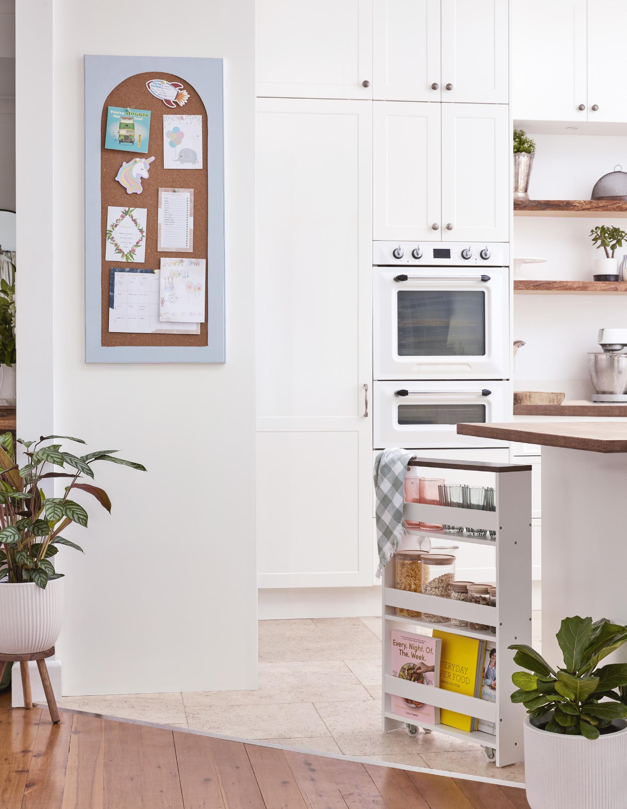 Keep track of household activities with this lightweight and slimline DIY planning station. The backing and arch are made from affordable 3mm plywood while the ‘cork board’ is a self-adhesive sheet and rubber mat hack. Use it for notes, calendars, invitations, grocery lists and the kids’ artwork.