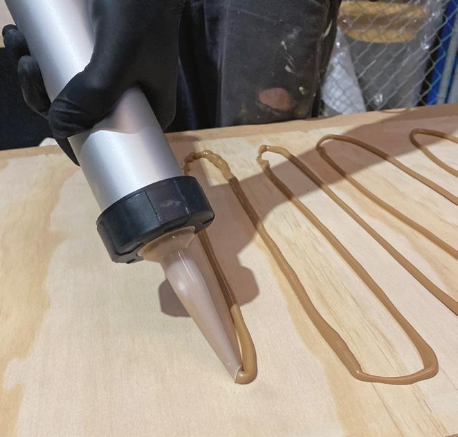 2 Use a utility knife and straightedge to cut the rubber tile to the same size as the ply panels. Use a sausage caulking gun to run a generous bead of flooring adhesive on one panel, then lay the tile on top. Place scrap ply and weights on the rubber to apply even pressure while the adhesive cures.