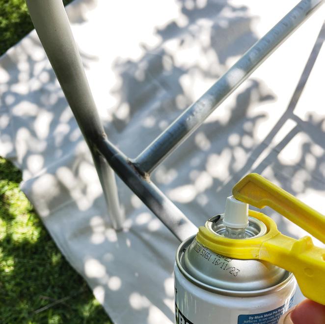 3 Spray rusted areas with rust converter, then leave to dry. Apply spray metal primer, then several light coats of metal spray paint using a smooth sweeping motion, leaving to dry after each coat. Tip: Hold spray can 20-25cm from the surface.