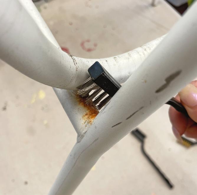 2 Use a wire brush to scrape off any loose paint or flaking rust. Clean the chair frame using soapy water and a lint-free cloth, rinse off, then leave to dry thoroughly. Prepare a drop sheet ready for painting.