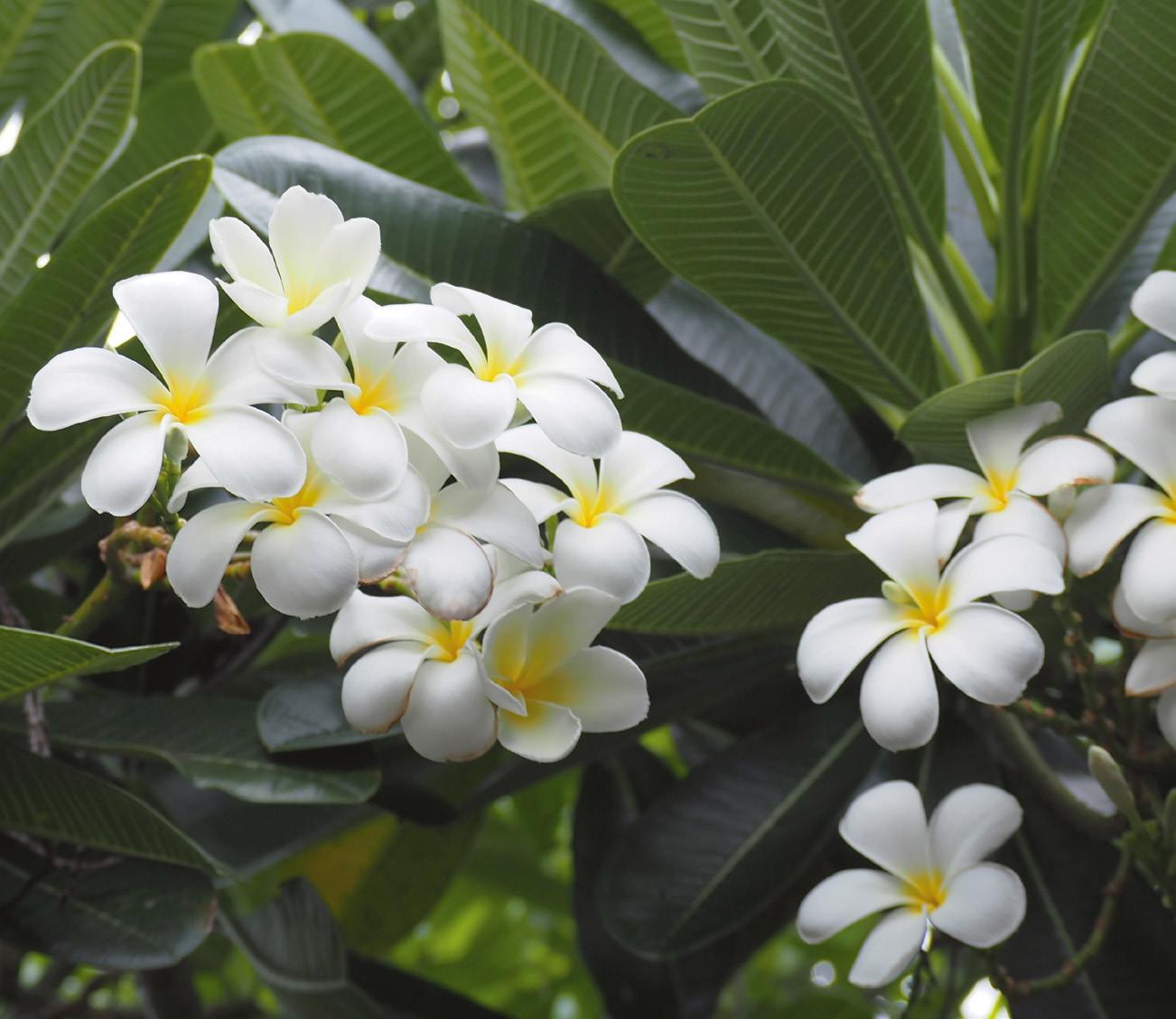 Frangipani rust is prevalent in warm and humid conditions. Prune and bin the worst-affected leaves and spray with a suitable fungicide.