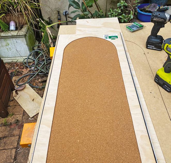 6 Attach arch to the pinboard front with flooring adhesive and a screw in each corner. Mask off cork with tape, then apply primer and two coats of paint to the arch, leaving to dry after each coat. Hang the pinboard according to the manufacturer’s instructions for the picture hanging kit. ●