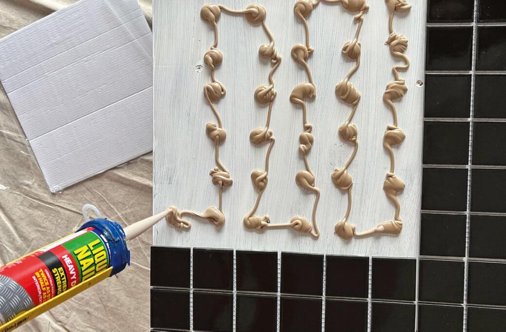 4 With cut sheets face down, apply adhesive to the legs, press onto a row of six, turning to finish each side, then add the top row, keeping the gaps even. Apply adhesive to the tabletop and press on tiles.
