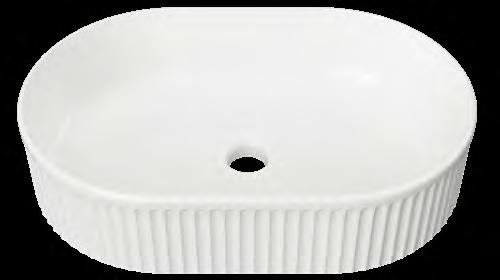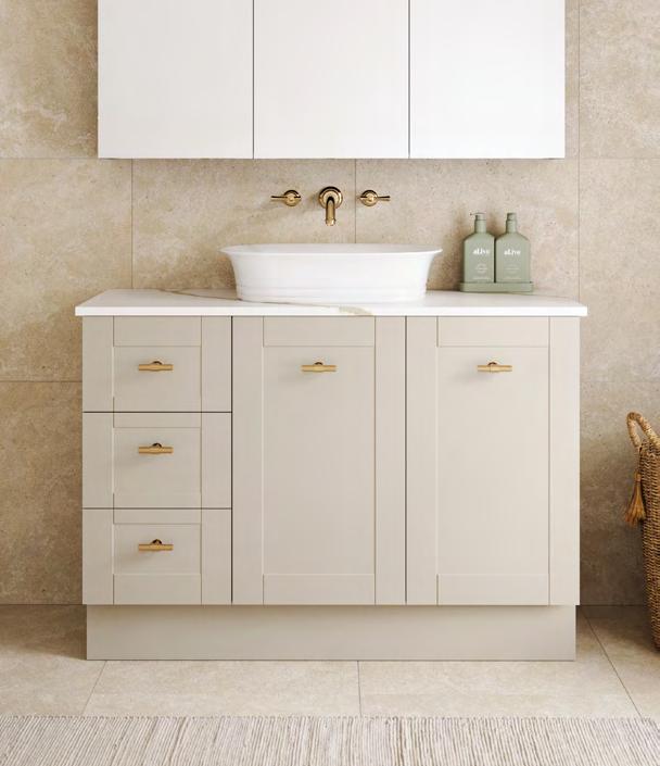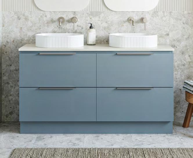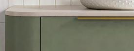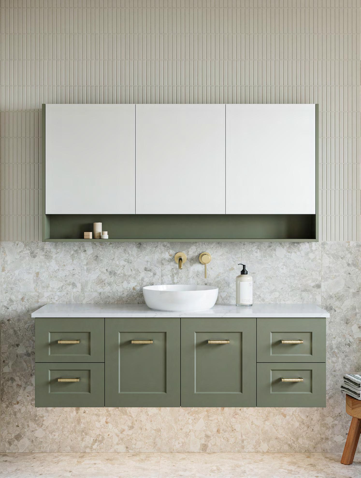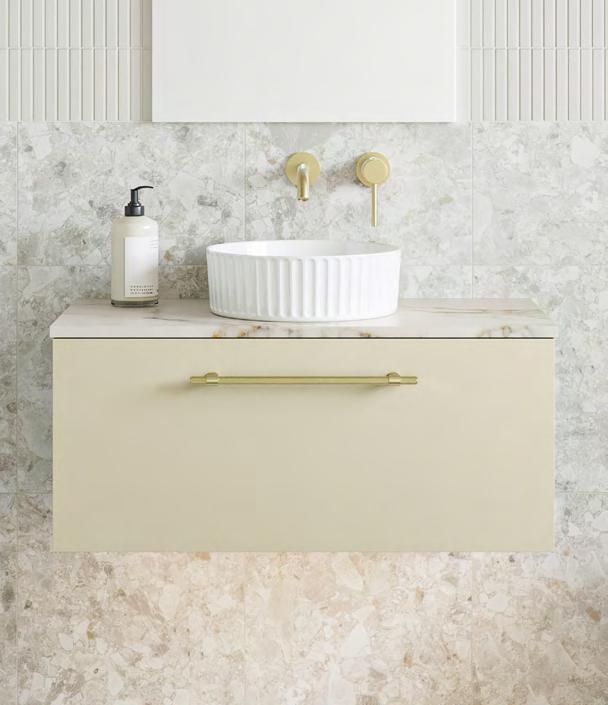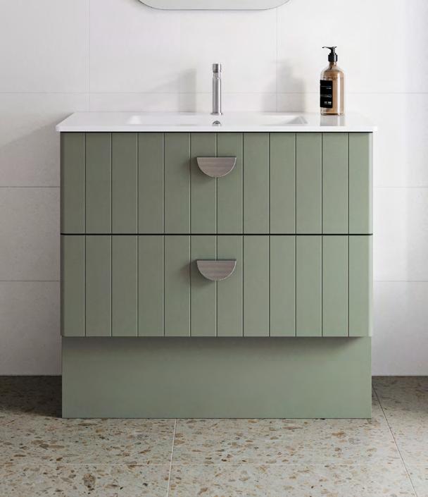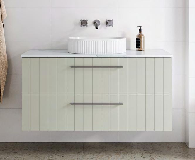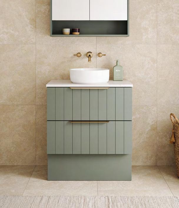 Vanity Light Pistachio Satin cabinet with Riverina SilkSurface top and Oval Flute above counter basin. I/N: 0651512