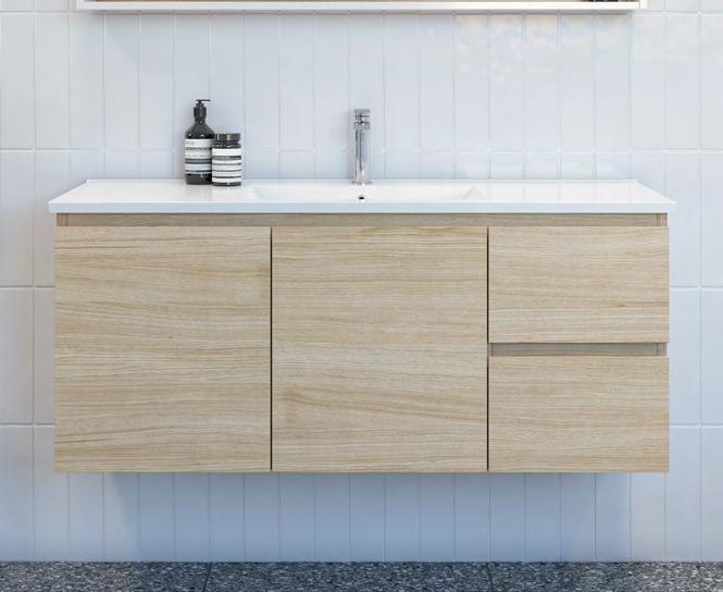 Tip: Light woodgrain vanities are perfect for creating a relaxed, coastal-inspired space.