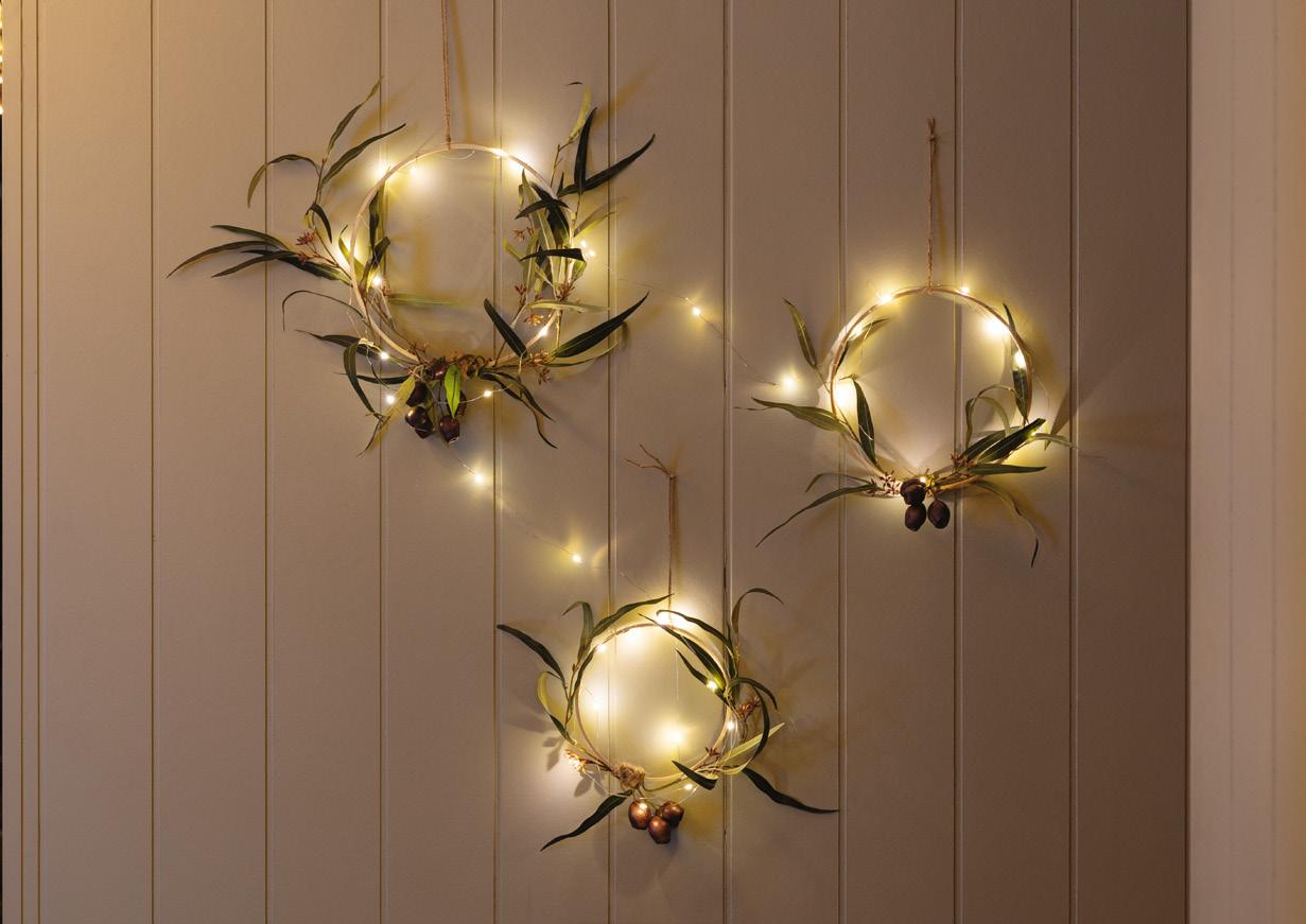 Starting with one of the top wreaths, wind the wire lights around ring, then take it over to an adjacent wreath, wind it around and take down to the remaining wreath and repeat. Tuck battery pack out of sight (such as behind a chair below). ●