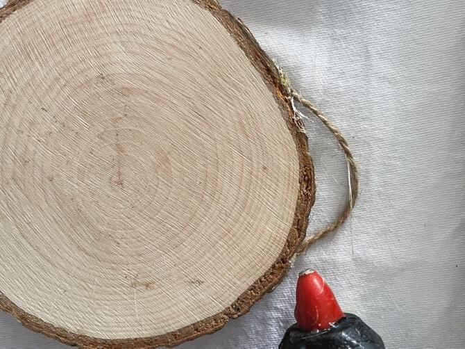 2 Cut 25 60mm-long pieces of twine, then hot-glue one to each timber disc as a hanger; let set. Write the numbers 1 to 25 on the slices in marker, arrange on the board in a triangle and mark the top of each hanger in pencil. Screw in cup hooks at marked locations, then stand board upright.