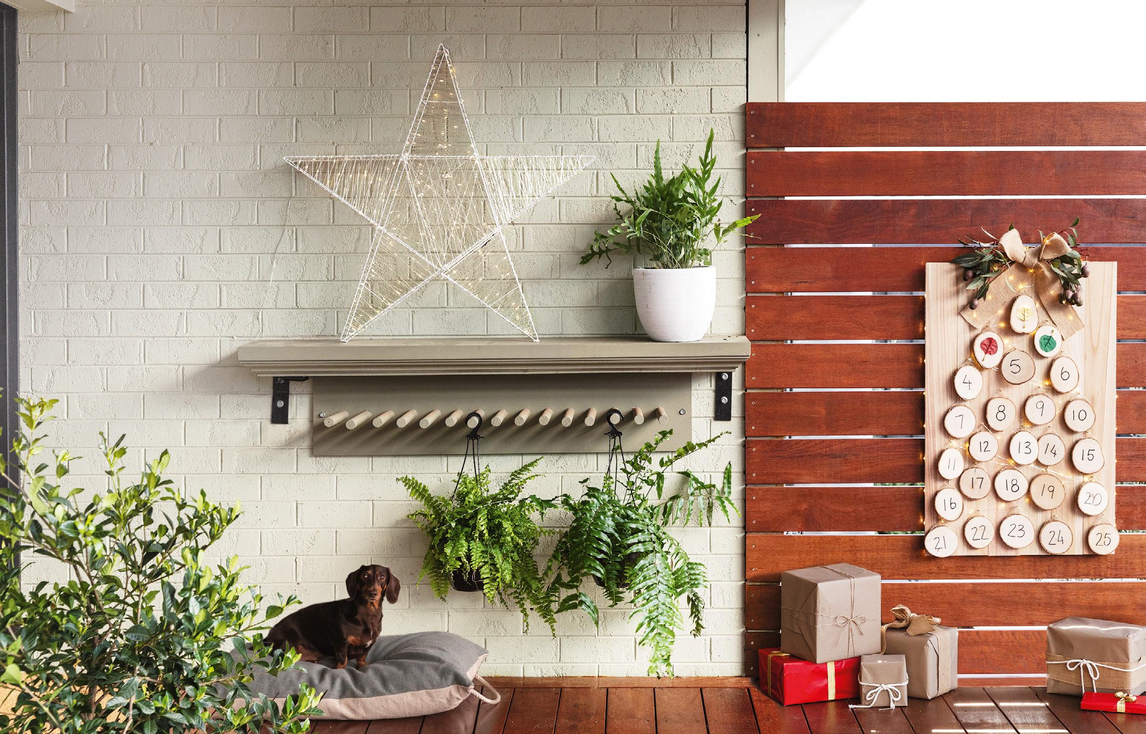 TOP ● DIY advent calendar made using: Alpine 900mm x 600mm x 9mm standard MDF panel, $18.40, I/N: 0590030•; Boyle 915mm x 100mm x 3mm hobby wood sheets, $8.72 each, I/N: 0375931; Everhang 10kg picture hanging kit, $7.88, I/N: 3930467; Grunt jute twine, $10/300m, I/N: 4310542; Un-Real ‘Eucalyptus Bud’ 115cm native artificial flowers, $12.50 each, I/N: 0198037, and ‘Aged Gumnut’ 70cm native artificial flowers, $12.50 each, I/N: 0204273; Boyle ‘Crafty Colour’ metallic acrylic paint in Rich Gold, $2.97/75ml, I/N: 0322590, and ‘Artist’ acrylic paints, $1.98/100ml each, in Red, I/N: 0353434, and Green, I/N: 0353435, and Lytworx indoor/outdoor battery operated copper wire micro LED twinkle lights in Warm White, $9.99/ pack of 100, I/N: 4352441. ● DIY giftwrap made using Wrap & Move ‘Kraft Paper’ 375mm paper roll, $5.38/15m, I/N: 0254399, Crafted 60mm natural burlap, $5/5m, I/N: 0323858, and 6mm macramé cord in White, $12.50/50m, I/N: 0323853, and Grunt jute twine, as before. All other products, stylist’s own. Some advertised services and products are not available at some Bunnings stores, but products can be ordered.