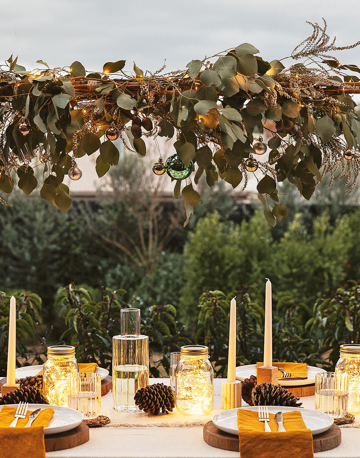 Weave foliage, baubles and lights into a crowdpleasing chandelier