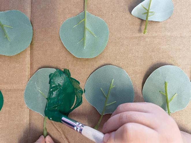 3 Using a paintbrush, apply 1-2 coats of paint to the back sides (with stems and veins) of artificial leaves in three colours, drying after each coat. Hot-glue to the backs of slices, let set, then hang on hooks. Form a burlap bow. Hot-glue gumnut sprigs and bow in place and drape wire lights.
