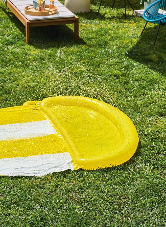 Slip into summer with an activity area to help the little ones beat the heat. Lay out a games area to allow kids to burn off some energy, with a shaded corner for the supervising grown-ups. “A water slide is so much fun and brings back memories for the adults, too,” says stylist Melle Van Sambeek. “Best of all, it’s quick to fold away at the end of the day.”