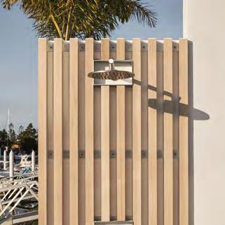 ● Marquee ‘Oasis’ 45cm outdoor cushion in Clay/Latte, $14.99, I/N: 0599006, and ‘Evoke’ 48cm outdoor cushion, $14.99, I/N: 0599014 (not available in WA). ● Mojo outdoor bench cushions in Grey, $46 each, I/N: 0496624. Glasses, Kitchen Warehouse, kitchenwarehouse.com.au. All other products, stylist’s own. Some advertised services and products are not available at some Bunnings stores, but products can be ordered. ● This nook is designed to maximise compact areas like a deck or balcony, but also works for a courtyard or patio. Slatted screen panels are triply useful – defining the zone, creating privacy and offering display – while a storage box doubles as seating. Add plants and it’s a garden getaway.