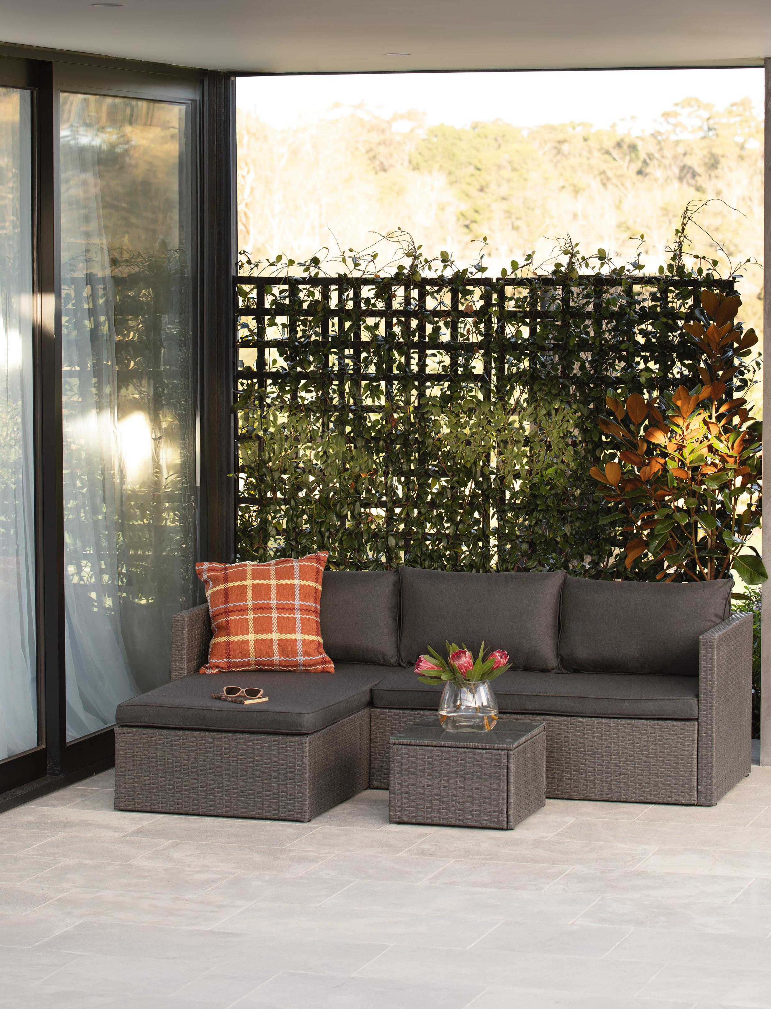 Abit of homework will help you find the perfect furniture for your outdoor zones. “Determining how you would like to enjoy your outdoor living space will support deciding which pieces to prioritise,” says Nathan Lorimer, Outdoor Living Merchandise Manager. “Measure the space available to position the outdoor furniture and visualise how common activities will flow around the layout.” Ensure there’s room for safe movement through the area and around opening doors. Placing a modular L-shaped sofa in a corner saves space, while a bench seat against a wall is also useful in tight areas. An elegant sofa style with slimline legs – showing the floor below – creates an open feel. A circular coffee table that allows for ease of movement works well in smaller zones, or opt for a side table or two.
