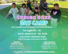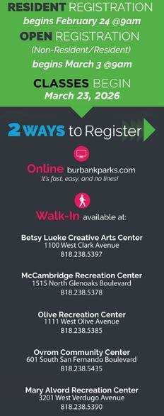 Burbank’s Recreation Centers are home to hundreds of engaging recreation classes designed for all ages and interests. Whether you’re looking to stay physically active, explore your creative side, or learn a new skill like coding, there’s something for everyone. These diverse offerings give participants the opportunity to build new skills and connect with fellow community members. Classes are offered at various times throughout the day and week, making it easy to fit learning and fun into even the busiest schedules. With new classes introduced several times a year, there’s always something exciting to try. Turn to page 24 to discover which class you’ll be taking this spring!