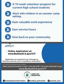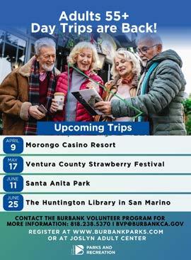 The Burbank Volunteer Program (BVP) is a City of Burbank program that connects local volunteers with nonprofit and public organizations throughout the community. Whether you’re completing high school servicelearning requirements, have a few spare hours each month, or are recently retired and looking to give back, BVP helps match you with opportunities that fit your interests and availability. Volunteer opportunities include park cleanups, tree planting events, delivering meals to homebound older adults, and much more. Turn to page 55 to explore current volunteer opportunities and find the perfect way to get involved.