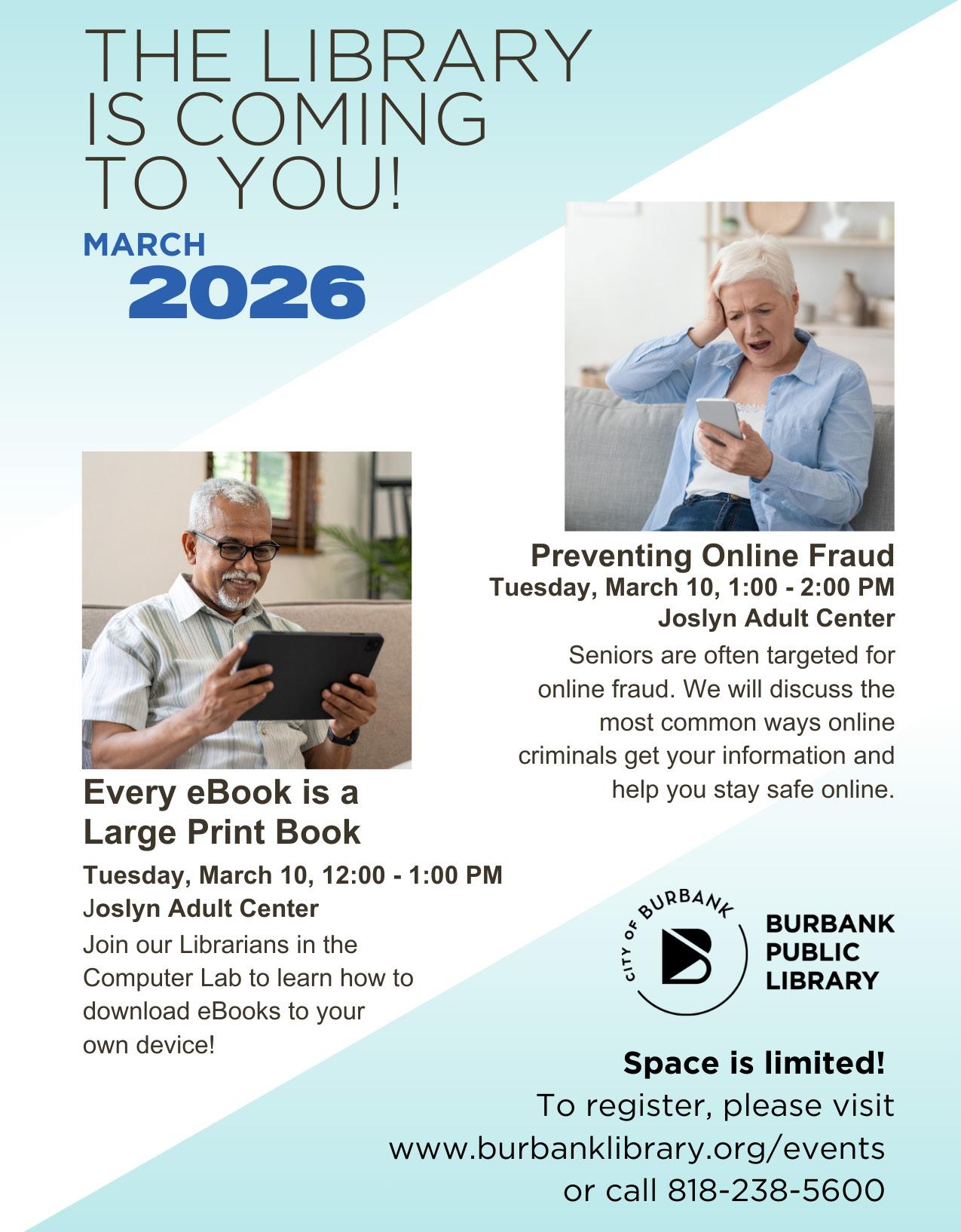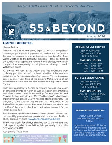 For the most up-to-date information on classes, events, and our monthly presentations, please visit Joslyn and Tuttle or check out our website: www.burbankca.gov/adults55