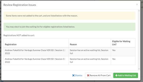 You can sign up for the waitlist If some sessions are full and others still have space you must still go through the checkout process to save your space You will see the error message below Click on add to waiting list and continue to check out