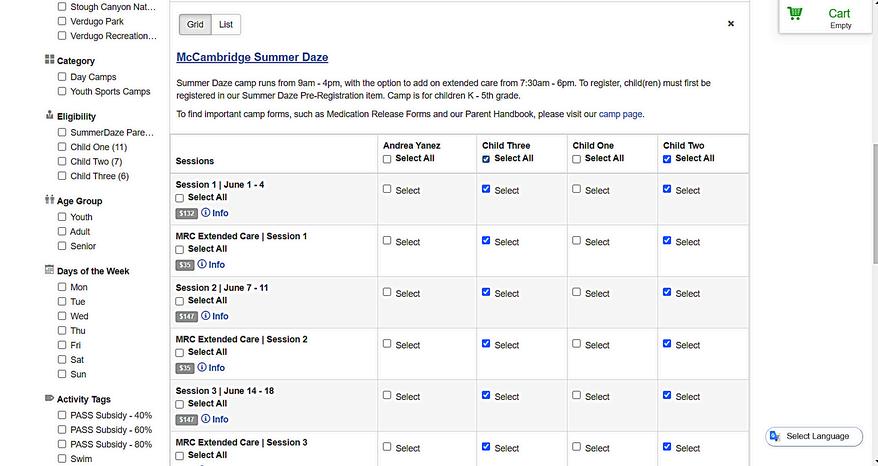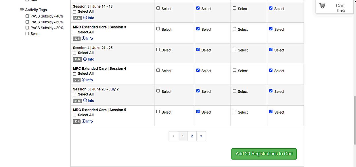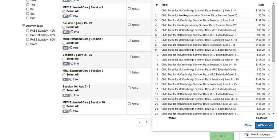 Step 3: Once all chosen weeks and participants are in your cart, click Checkout. Extended Care sessions will be available to register for at a later date.