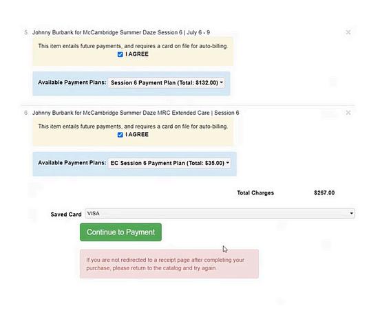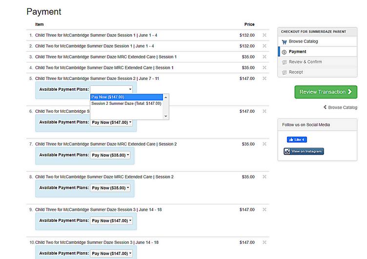 Step 4: Click on the drop down menu for each item to choose the payment plan. Session 1 will be charged in full at the time of registration.