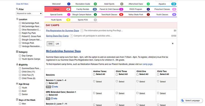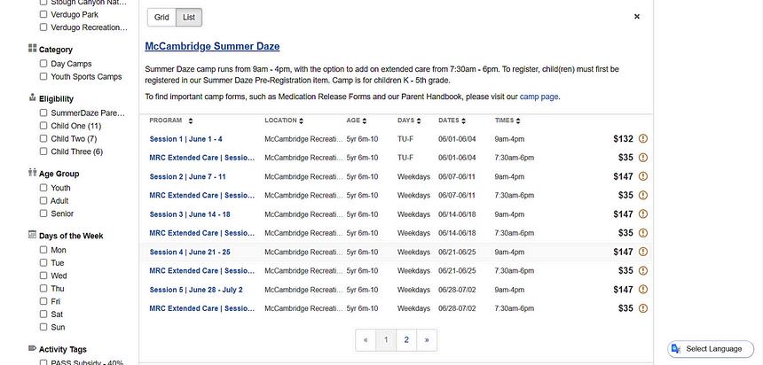 Step 1: Under the Camps Tab, look for the camp of interest. The drop down menu will default to the Grid View. This view may be easier for families choosing multiple weeks and/or multiple kids. If only choosing a week or two, List View may be more convenient.