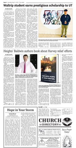 chase online at www.diangelopublications.com/books/ heroes-hope-high-water, at a cost of $22.50. Baldwin said they also are available at stores such as Manready Mercantile, 321 W. 19th St. Suite B; KuhlLinscomb, 2418 W. Alabama St.; Brazos Bookstore, 2421 Bissonnet St.; and in the gift shop at The Museum of Fine Arts, Houston, 5601 Main St. “I had never written a book before,” Baldwin said. “It was fun for me to do.” Baldwin owns Boulevard Realty, 927 Studewood St. Suite 100, in addition to being a member of the Houston Planning Commission. He is a past president of the Houston Heights Association, having served multiple terms, as well as a former Leader of the Year. He said his book is an extension of a commencement speech he gave in 2018 at