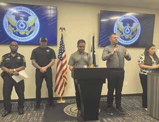 Fort Bend County Judge KP George, center, conducts a press conference with Sheriff Ed Fagan and Greg Babst, emergency management coordinator, along with American Sign Language and Spanish translators, last week. Photo by Ken Fountain