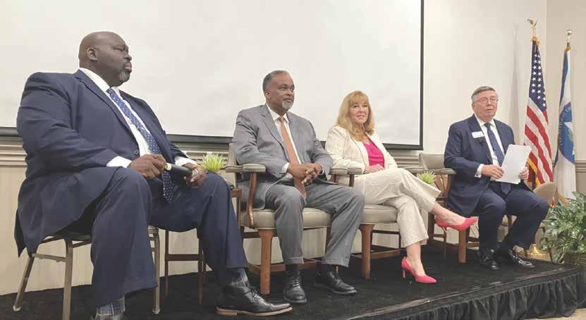 Lamar CISD Superintendnet Roosevelt Nivens, left, Stafford MSD Superintendent Robert Bostic, and Fort Bend ISD Superintendent Christie Whitbeck discuss school safety a Fort Bend County Chamber of Commerce event moderated by Jim Rice.
