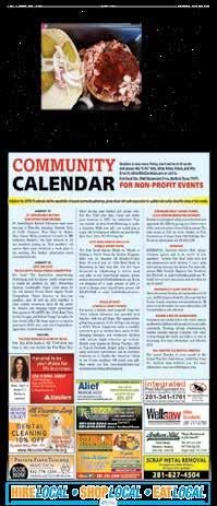 education, and entertainment. All seniors over 50 invited. For more information, call 713-859-5920 or 281-499-3345. Deadline is noon every Friday. Limit entries to the “5 Ws” Who, What, When, Where, and Why. Email to jsazma@fortbendstar.com FOR NON- PROFIT EVENTS EXPERIENCE COUNTS! 35+ YEARS SERVING FORT BEND COUNTY 14090 S.W. Freeway Suite #200 Sugar Land, TX 281.243.2300 (Main) • KenWoodPC.com 281-243-2344 (Direct) FULL SERVICE & RETAIL STORE FOR DIY 2 8 1 - 3 4 1 - 1 7 6 1www.integrated-pest.com Family Owned Serving Fort Bend Since 1984 LISA N SIMS, AGENT 11647 S Highway 6 Sugar Land, TX 77498 Toll Free: 281-201-2448 lisa@agentlisasims.com Honored to be your choice for life insurance. Monday - Friday 9 - 6 Saturday 10 - 2 After hours by appointment Have a Non Profit? Need to get it out there? Put here in our community calendar! Let the community know in our Community Calendar! Contact: jsazma@fortbendstar.com See us online www.FortBendStar.com THE STAR Wednesday, August 9, 2023 • PAGE 7
