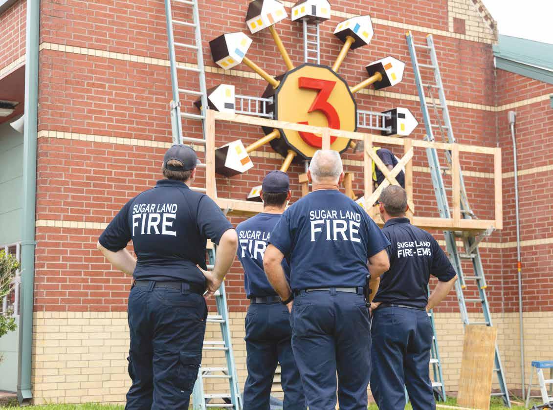 Sugar Land frefghters admire ‘Around the Clock,” a new public wall sculpture at Fire Station No. 3. Courtesy City of Sugar Land