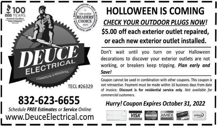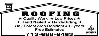 Page 6 • Saturday, October 7, 2023 • The Leader JUNK HAULING IMPROVEMENTS GENERAL HOME IMPROVEMENTS GENERAL HOME IMPROVEMENTSGENERAL HOME IMPROVEMENTSGENERAL HOME IMPROVEMENTSGENERAL ELECTRICAL SERVICES PLUMBING Wanting to run a classified ad? CALL 713-686-8494 Monday - Friday. We accept credit cards. HEAT/AIR CONDITIONING ADULT CARE PETS GARAGE/ESTATE SALE HEALTH & FITNESS LOCAL LAWN & GARDEN GUIDE Advertise Your Lawn Care Service With ROOFING At Reasonable prices •Patios •Driveways •Room Additions •Expedient Work American Made 713-703-8488 Jim “God Bless America” QUALITY CONCRETE WORK Pete’s Quality CUSTOM PAINTING WATER DAMAGE REPAIRS • Exterior/Interior • Pressure Washing • Sheetrock Repair • References • Insured petesqualitypainting300@gmail.com 713-201-5569 832-372-5577 Including Flooded Homes Re-roofs • Repairs 3308 Ella Blvd • (713) 680-3530 All Work Guaranteed Free Estimates CAMPOS Roofing “The Residential Roofing Specialists” www.camposroofing.com Hardi Siding • Gutters • Painting • Windows 3825 Pinemont Dr. Adam’s WOOD FLOORS 832-515-4214 Installation Repair Sanding Finishing PRIME ROOFING Commercial • Residential New Roof • Re-Roof 713-681-5001 www.primeroofing.com Washers - Dryers Dishwashers - Ranges KINARD’S Appliance Service 281-350-6255 713-857-2050 M&M Pet Sitting Affordable Pet Care In Your Home Will Treat Your Loved Ones As My Own Bonded Mitzi 713-444-8517 M S Afford BLUE MOON ANTIQUES AND ESTATE SALES Antiques and Collectibles Like us on www.facebook.com/ bluemoonantiques-houstontx Providing Estate Sales Services 3311 Ella • 832-286-7882 Complete Pavers Gilbert • Patios • Decks • Driveways • Brick Columns 281-948-4879 HAR BINGER electric Lights-Plugs-Breakers Cover all electric needs Licensed-Insured 713-721-5490 TEL. 17823 BRAVENEC ELECTRIC Since 1953 - TECL 19210 Res./Comm. Wiring 713-864-4168 cc accepted bravenecelectric@gmail.com Martinez Concrete Works martinezconcreteworks@gmail.com Bonded and Insured • Free Estimates 713-408-0137 • Driveways • Patios • Sidewalks • Foundation Additions • Stamp Concrete Free Estimates Insured & Bonded Residential & Commercial Trimming • Removal Pruning • Topping Stump Grinding 713-480-9450 RAMIREZ TREE SERVICE • Residential • Commercial • Service Licensed - Insured - 26 Yrs. Exp. MASTER #178565 TECL #25670 Native Houstonian - 46 Yrs. John Kuenstle Electric,LLC Oak Forest Resident/Office 832-425-2152 - Free Estimates “A” On Angie’s List John Kuenstle Electric,LLC Oak Forest Resident/Office • Residential • Commercial • Service Licensed - Insured - 34 Yrs. Exp. 832-425-2152 - Free Estimates MASTER #178565 TECL #25670 Native Houstonian - 52 Yrs. “A” ON ANGIE’S LIST TACL A020360E 713-869-8876 “Honesty is our best discount” A/C AND HEATING SALES, SERVICE & MAINTENANCE LUXURY LAWNS Lawn Maintenance Landscape & Design Sprinklers/Drainage Systems Free Estimates 20 yrs. exp. 713-688-4244 David Bartula Houston Heights 281-728-7552 ROOFERS www.houstonheightsroofers.com Roofing, Siding, Painting, etc. Keep it local and call the pros. Aikido - Judo Japanese Martial Arts 8th Degree Black Belt 713-826-5877 www.aikibudo-aikido.com Manny Junk Remover 281.414.8698 • Home• Yard • Garage• Storage • Shed Removal TONY MUNOZ FENCE CO. 45 yrs. Exp. - FREE EST. • Chain Link • Wood • Wrought Iron / Hand Rails • Gate Operators 713-680-0059 H H VETERAN OWNED H H Residential & Commercial Please Give Us a Call for More Details 832-515-2855 heartsdedicated4@gmail.com Are You Looking for Someone to Care for Your Senior or Family Member in Your Home or a Facility? Dedicated Hearts Provides: • Exceptional Personalized Care • Companionship • Light House Keeping • Meal Prep, etc. Serving NW Houston Since 1973 FREE estimates 713-299-2711 ROOFING by SERNA BROS. Call Gilbert 346-303-7003 jose.salazar020473@gmail.com Texas Lawn Services & Landscaping • Flower Bedding • Mowing • Edging • Fertilizing• Mulch • Trimming and More 281-389-4654 Charlie ALL HOME REPAIR • Flooring/Carpet • Ceramic Tile Repair • Sheetrock • Painting • Plumbing • Sheet Vinyl & Tile • Roofing Repair • Shower/Bath Redo • Tile • Fence Repair • Termite/Water Repair 40 Yrs. Exp. & Leader Advertiser Call Sam 713-582-5500 713-686-2285 Cooling & Heating Res. - Com. 713-460-COLD(2653) www.acmanhouston.com TACL B27781E American Standard Authorized Dealer with this ad $20 OFF DMI CONCRETE CONTRACTOR 713-296-9753 For all your construction / remodeling needs Gilbert’s Landscape Lawn Care Mowing • Edging • Blowing Flower Bedding • Fertilizing FREE ESTIMATES – 17 Yrs. Exp. (281) 948-4879 TREE CUTTING & TRIMMING Flower Beds • Sell Flowers • Mulch Lawn Service • Shrub/Tree Trimming Fertilizer & Weed Control Roofs & Gutter Cleaning Power Washing & Trash Removal & More! 832.591.8398 Rubio Landscape LANDSCAPING SERVICES • Lawn Maintenance • Fertilize • Mulch, Tree Trimming • Flowerbed Cleanup • Grass Installation Verdeco 713-703-6406 FENCES & DECKS Repair & Installation All Type Fences • Chain link • Wood • Ornamental Iron Small jobs welcome Call 7 Days Jose Cell (281) 221-0637 ` COOPER PLUMBING, LLC • RESIDENTIAL / COMMERCIAL • FAMILY OWNED • WATER HEATER • LEAK DETECTION • LICENSED, BONDED & INSURED FOR ALL YOUR PLUMBING NEEDS CALL: 832-441-9683 EUGENE HAULS TRASH: Cleans Garages, Trims Trees. 832-890-5453 All Makes & Models I Buy cracked Flat Panel TV’s 1622 W. 23rd David’s “We Make House WeMakeHouseCallsCalls” a House Painting • Interior/Exterior • Sheetrock Repairs • Door Renishing • Wood Repairs • Pressure Washing Ramiro Garcia 713.206.5965 Frank Montes Painting Interior/Exterior Sheetrock Repair Match any texture Roofing Work Carpentry Handyman Services Power Washing Maid Service Good References (713) 962-3474 PAINTING 713-862-7320 Free Estimates on Fencing IT’S NOT JUST A FENCE IT’S A