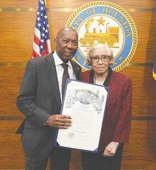 Photo by City of Houston sta photographer Houston Mayor Sylvester Turner presented Ruth Perrodin Thornton with a proclamation declaring Sept. 28, 2023, Mrs. Ruth P. Thornton Day in honor of her 100th birthday.