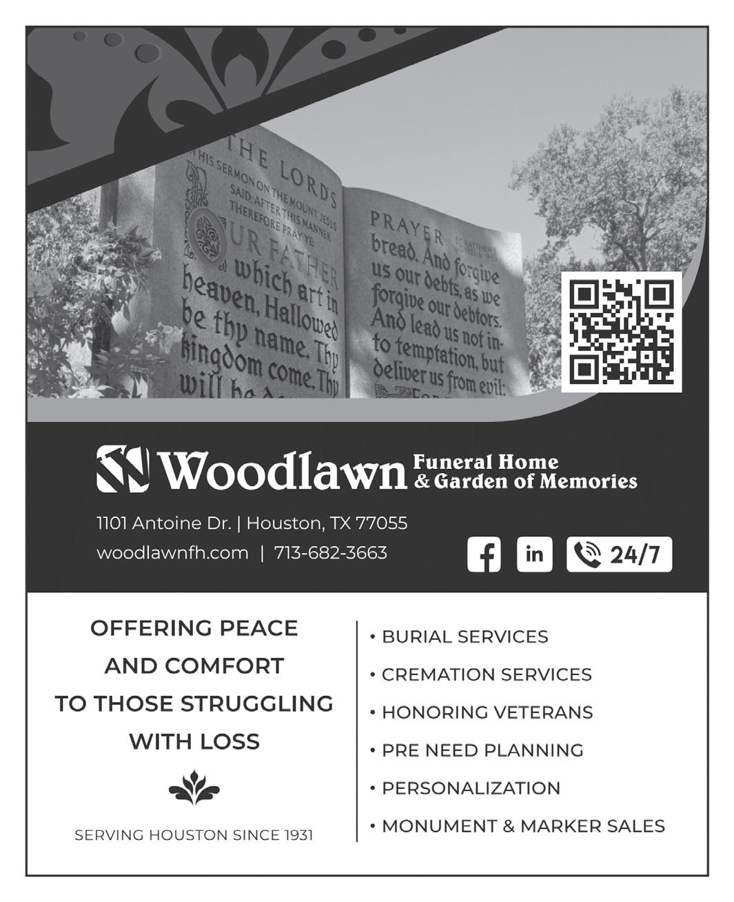 The Leader • Saturday, October 7, 2023 • Page 5 Support shopping • health • services • dining R.B. GARAGE DOORS Garage Door Experts • 20 Years Experience Affordable Prices • Free Estimates ROGELIO 832-755-5245 www.rbgaragedoorshouston.com rbgaragesdoors@gmail.com • Genie • Craftsman • Lift Master • Chamberlain * Garage Door Openers * Crashed Door Resets * Lube & Tunes * Springs 1015 E 11th St., Houston TX 77009 (Across from Hogg Midde School) Proceeds from MAM Resale support MAM’s life-changing programs and services that build stable families, a dynamic workforce, and vibrant communities... together! Store Hours Monday-Friday 9am-5pm Saturday 10am-4pm Donations Accepted Thursday-Saturday 10am-3pm www.MAMHouston.org www.drnaftis.com State-of-the art procedures, instruments & techniques Mathew Naftis, D.D.S. $80 COSMETIC DENTISTRY Exam, X-Ray & Cleaning 1214 W 43rd Ste 300 713-682-7939 “One of Houston’s Top Dentists” — HTexas Magazine 2004-2018 Regularly $1 0 CARE CREDIT NEW PATIENT SPECIAL Woodlawn Funeral Home & Garden of Memories is proud to provide Domani for Grief and Loss resources to support families as they deal with the difficult loss of a loved one. Join us for our grief support group receptions. Delicious breakfast compliments and refreshments will be served.