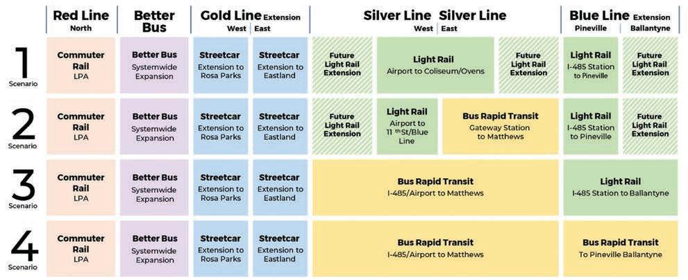 CATS has developed four scenarios that diverge when it comes to developing the Silver Line (originally pitched as light rail to Matthews) and extending the Blue Line (to Pineville and then Ballantyne): • Scenario 1: This would allow the Silver Line to be built from the airport to Bojangles Coliseum. Sections west of the airport and east of the coliseum would become future extensions. Th is scenario would also