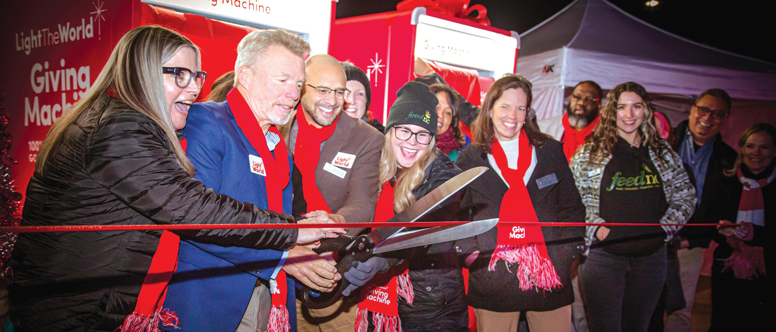 Community leaders and volunteers celebrate the official opening of the Light the World Giving Machine in Charlotte during the 2024 ribbon-cutting ceremony.