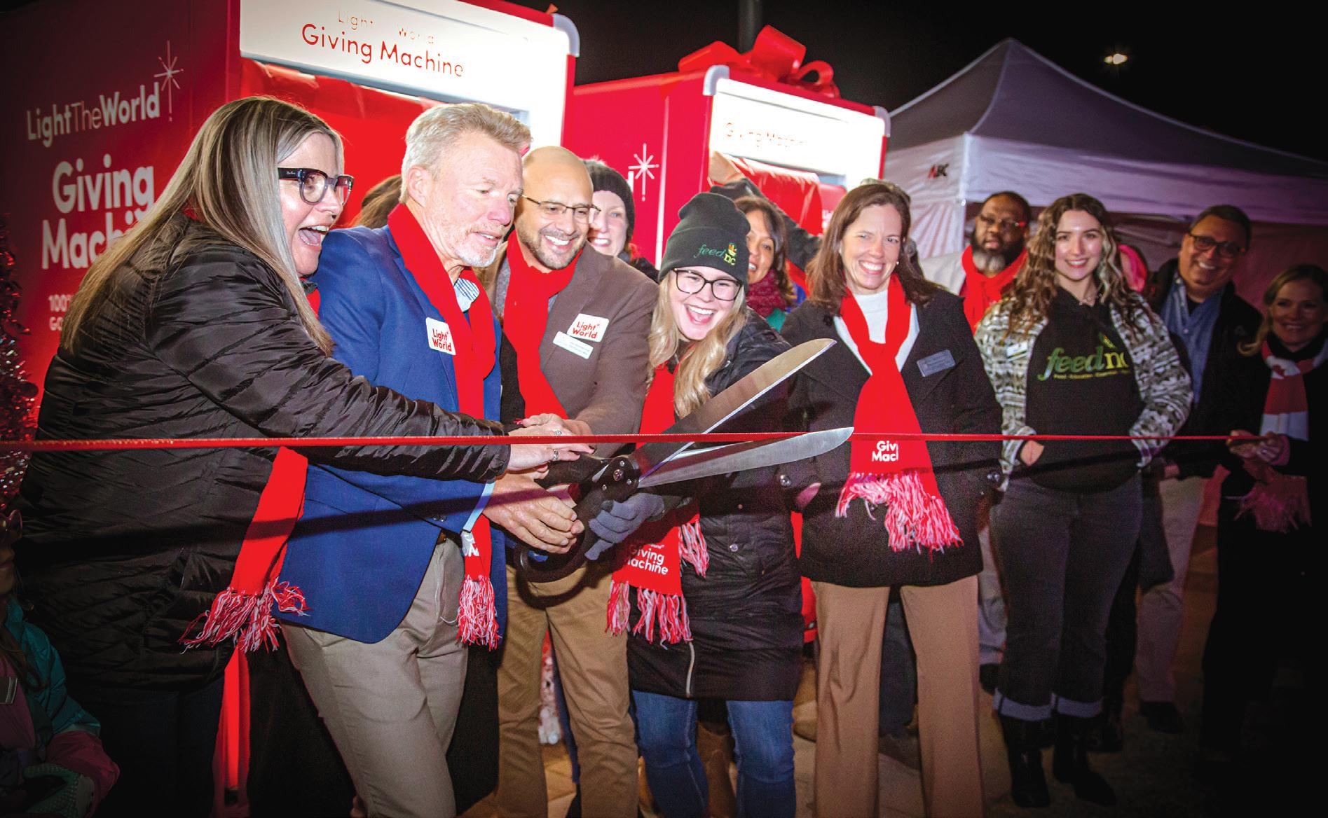 Community leaders and volunteers celebrate the official opening of the Light the World Giving Machine in Charlotte during the 2024 ribbon-cutting ceremony. The Giving Machine returns this year in a new location. Visit Carolina Place Mall from Nov. 19 to Dec. 7.