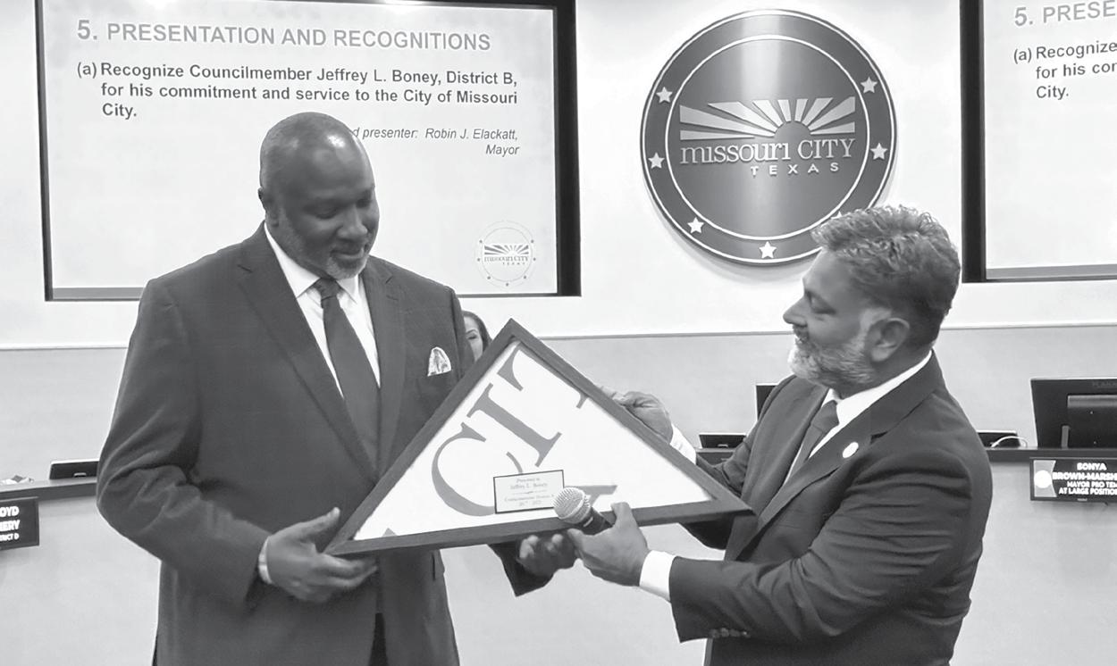 Missouri City Mayor Robin Elackatt presents a city flag to outgoing District B Council member Jeffrey L. Boney to honor his eight years of service. Photo by Ken Fountain.