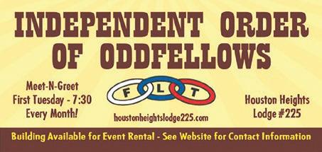 The history of Odd Fel lows in the Heights is a long one. In 1905, a group of Odd Fellows residing in Houston Heights petitioned the Grand Lodge of Texas to charter a lodge in their area. And by 1912, it had become of the most active lodges in the Houston area. Eventually, the group was able to build a