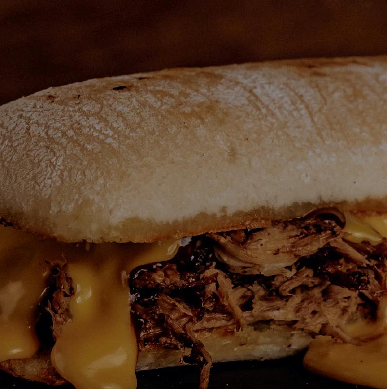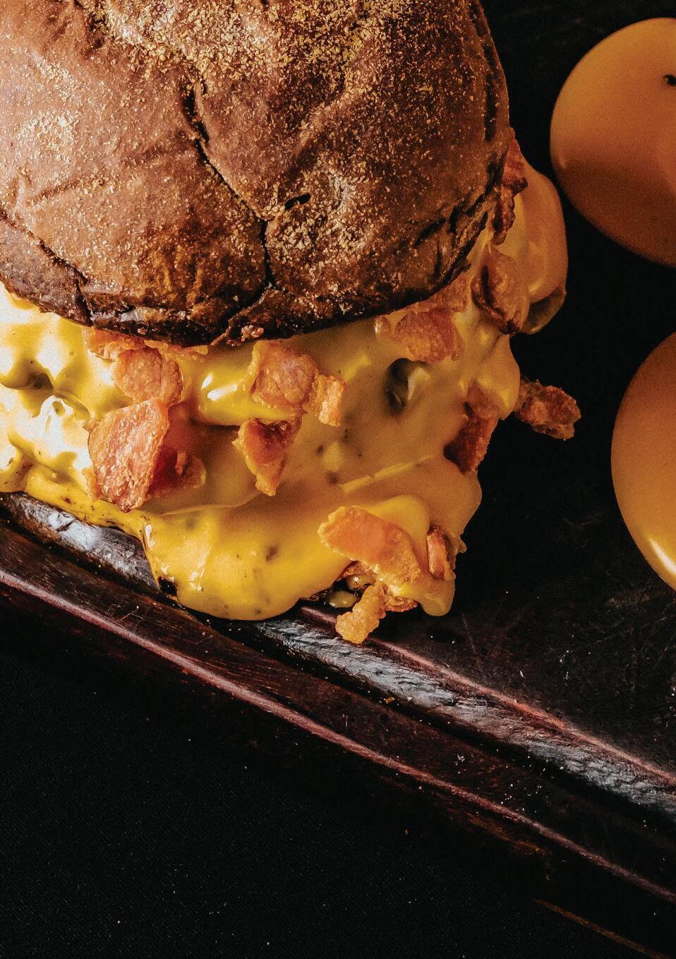 Pão de Ciabatta, Blend de Ca rn e s a s s a d os l e nta m e nte, American Cheese, Rúcula, Picles e Maionese Grill.