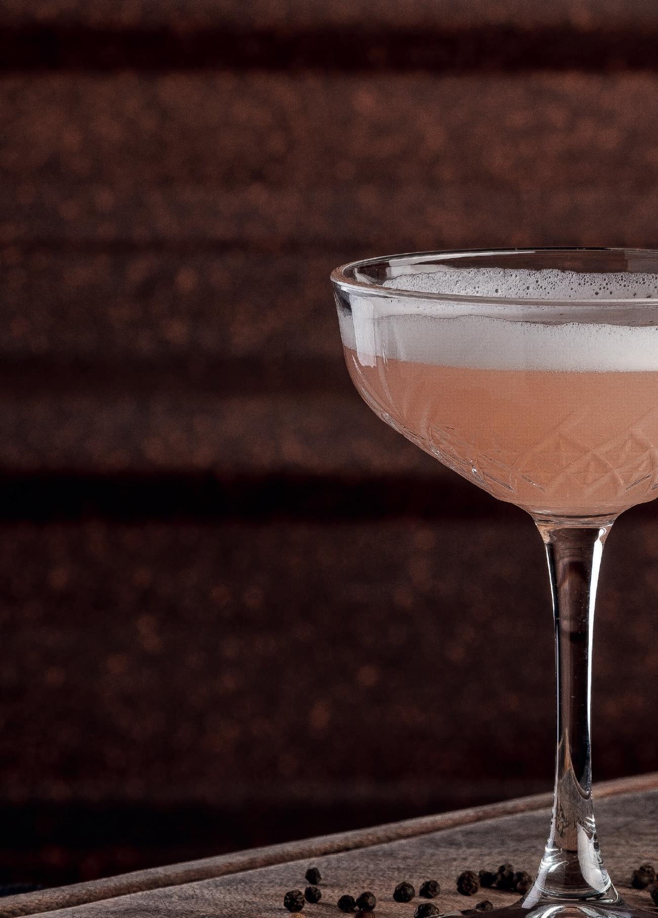Gin Inglês com Infusão de Nibs de Cacau, Vermute Tinto, Amaro® e Campari®.