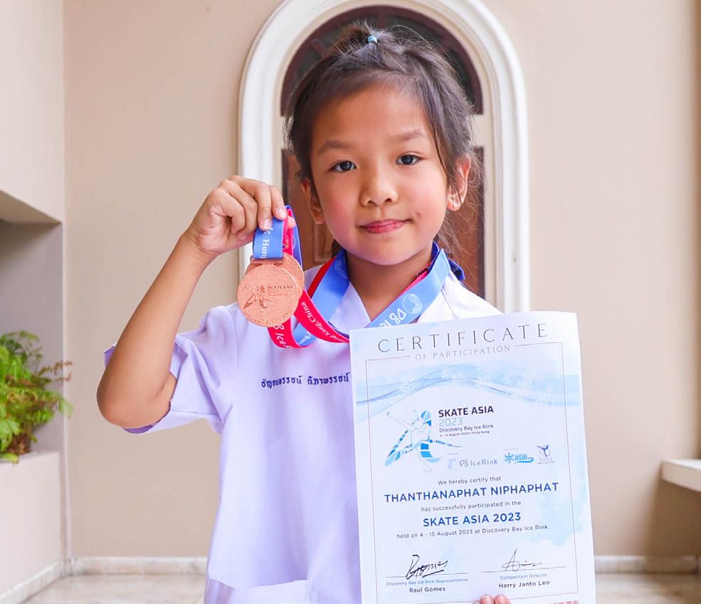 Ms. Thanyathanaphat Niphaphat, a Prathom 2 student, won the 1st prize in the Spotlight Program and the 2nd prize in the Solo Program in the SKATE ASIA 2023 Competition, as well as awarded a gold medal and a certificate at Discovery Bay Ice Rink, Hong Kong on August 7-8, 2023.
