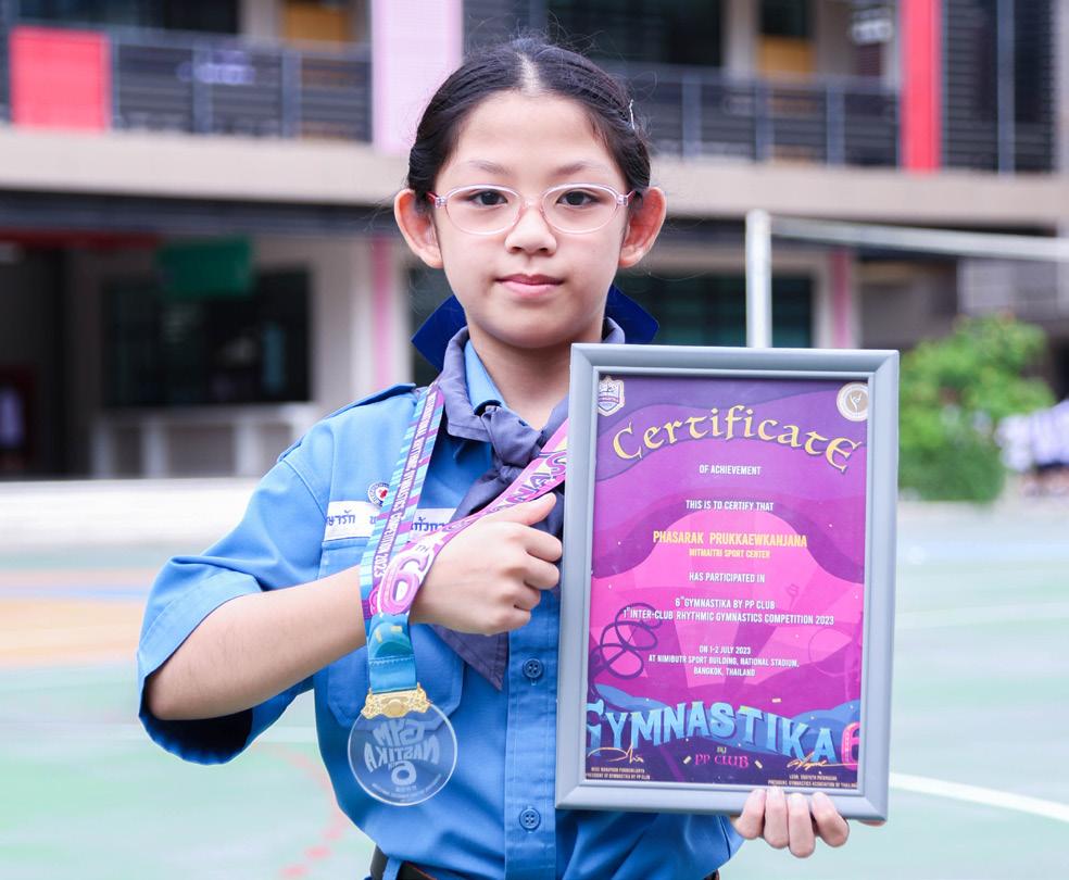Ms. Phasarak Pruekgaowkanjana, a Prathom 5 student, won the 1st place in the gymnastics competition ‘The 6th Gymnastika by PP Club & 1st Inter-Club Rhythmic Gymnastics Competition’ in the female gymnastics category of level 2 (10 years of age), organized by the Gymnastika by PP Club in collaboration with the National Gymnastics Association at Nimibutr Building, National Stadium 9 on July 9, 2023.